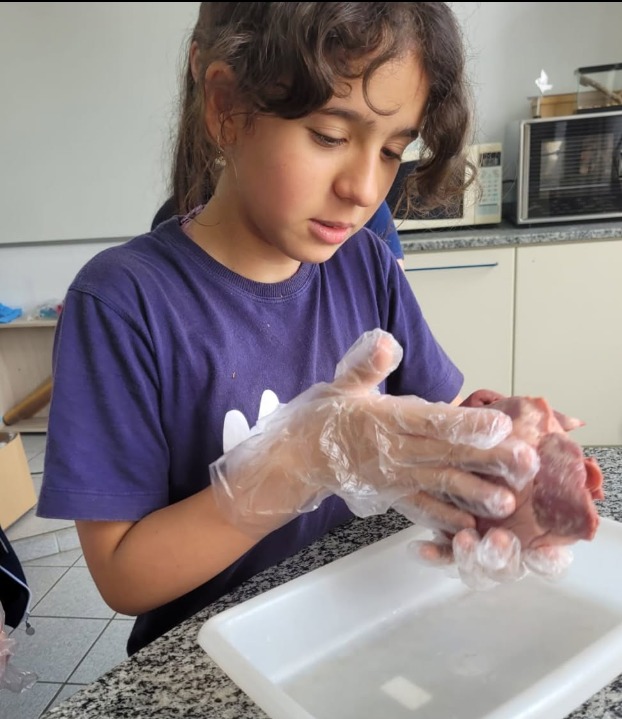 Para encerrar os estudos sobre os sistemas digestório, respiratório, urinário e circulatório, os alunos puderam observar e tocar em rins, coração e fígado, explorando de forma prática o que aprenderam em aula.